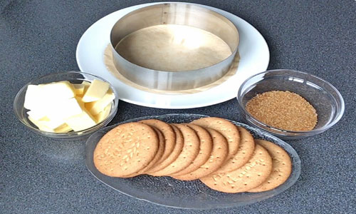 For the base crush the biscuits to a fine crumb and place in a mixing bowl.