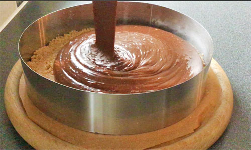 Remove the biscuit base from the fridge pour the prepared filling directly onto the biscuit base.
